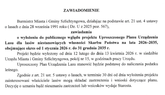 Zawiadomienie z dnia 12 lutego 2026 r. o wyłożeniu do publicznego wglądu projektu Uproszczonego Planu Urządzenia Lasu.